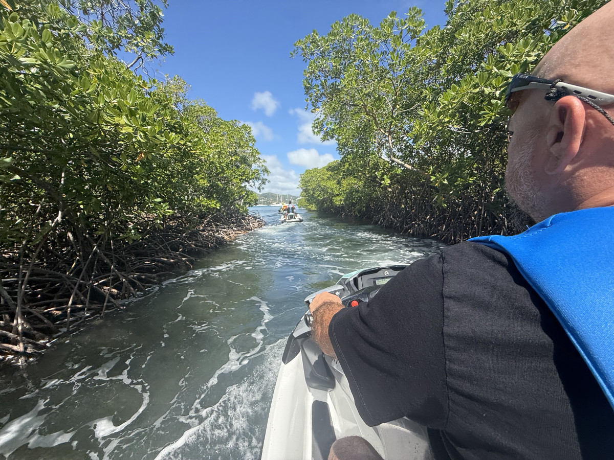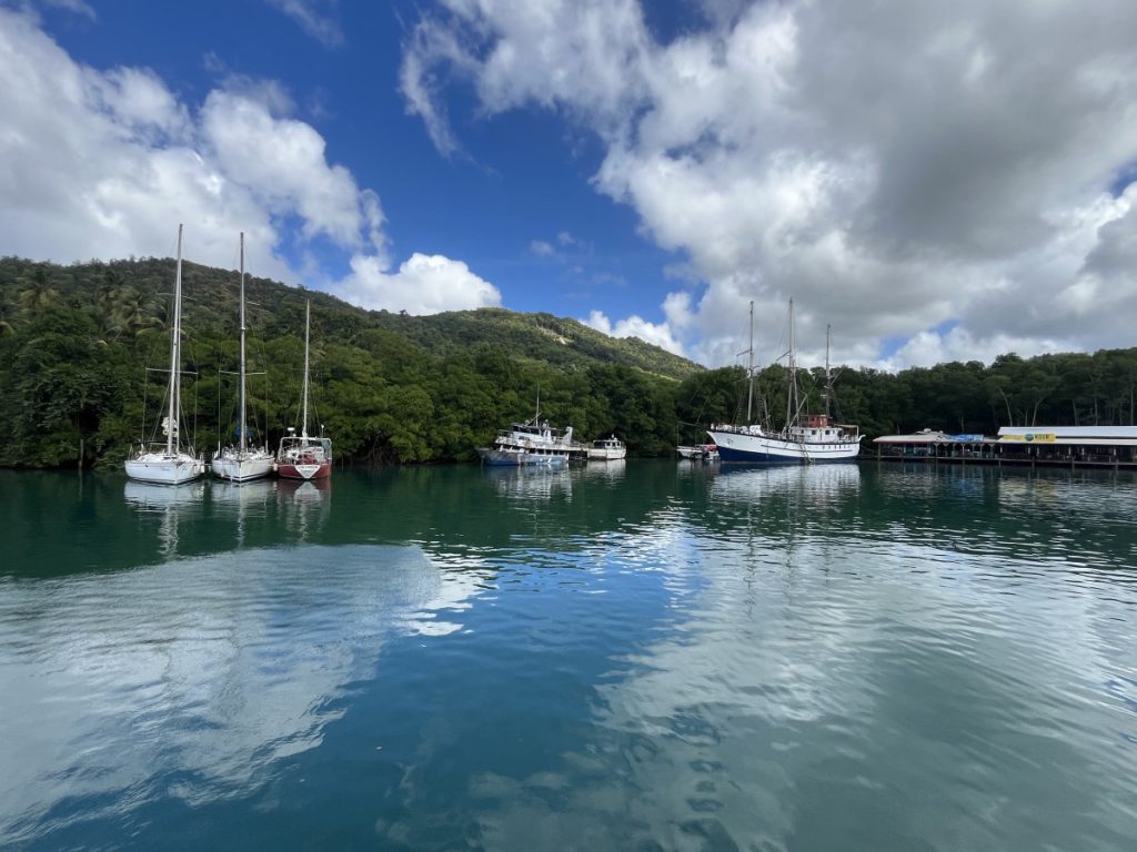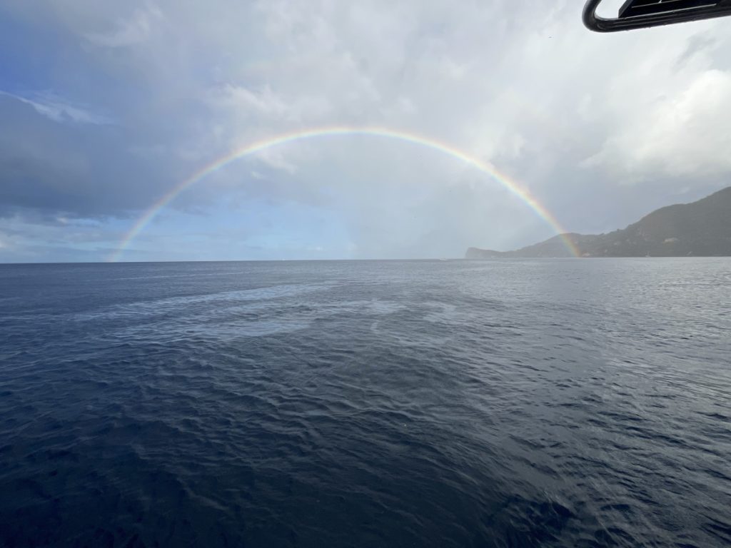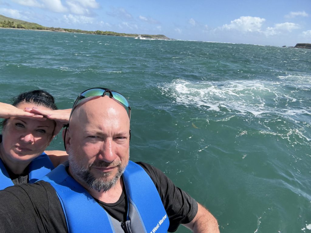 Dzisiejszy poranek nie mógł się zdecydować w jakiej odsłonie się nam ukaże i raz wychodziło słońce a za chwilę lało okrutnie. Nawet piękna tęcza nie zakończyła tego konfliktu. Po śniadaniu popłynęliśmy do zatoczki w rezerwacie przyrody posnurkować i pooglądać rafę koralową. Następnie udaliśmy się do małego portu na Saint Luci gdzie okazało się, że żeby zatankować łódkę, musimy się odprawić. Zjedliśmy obiad na jachcie i pokręciliśmy się pół godziny obok portowego hoteliku. W tym czasie kapitan nas odprawił oraz zaopatrzył w paliwo i wyruszyliśmy w rejs powrotny. Oczywiście droga na Martynikę była dla większości drogą przez mękę 😜- długa, wyboista, wietrzna, a finisz z przytupem. Przytup dlatego, że końcówkę „zrobiliśmy” w zalanej kajucie, bo na chwilę uchyliliśmy okno 😜 Do mariny na Martynice dotarliśmy późno, zrobiliśmy porządek, wykąpaliśmy się w łazience portowej, spakowaliśmy, zjedliśmy kolację i mocno zmęczeni poszliśmy spać. O 6:00 rano już byliśmy na nogach bo szykowaliśmy się do zdania łódki, którą najpierw trzeba było przecumować, bo noc spędziliśmy na stacji benzynowej 😜 Później udaliśmy się na wcześniej zarezerwowane skutery wodne, a następnie do destylarni rumu 😀 Tam po zwiedzaniu wskoczyliśmy w zimowe ciuszki i pojechaliśmy na lotnisko. I tutaj zakończę, chociaż jeszcze jesteśmy w połowie drogi do domu. Myślę, że jak nie zapomnę to maznę krótkie podsumowanie 😉